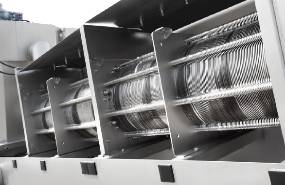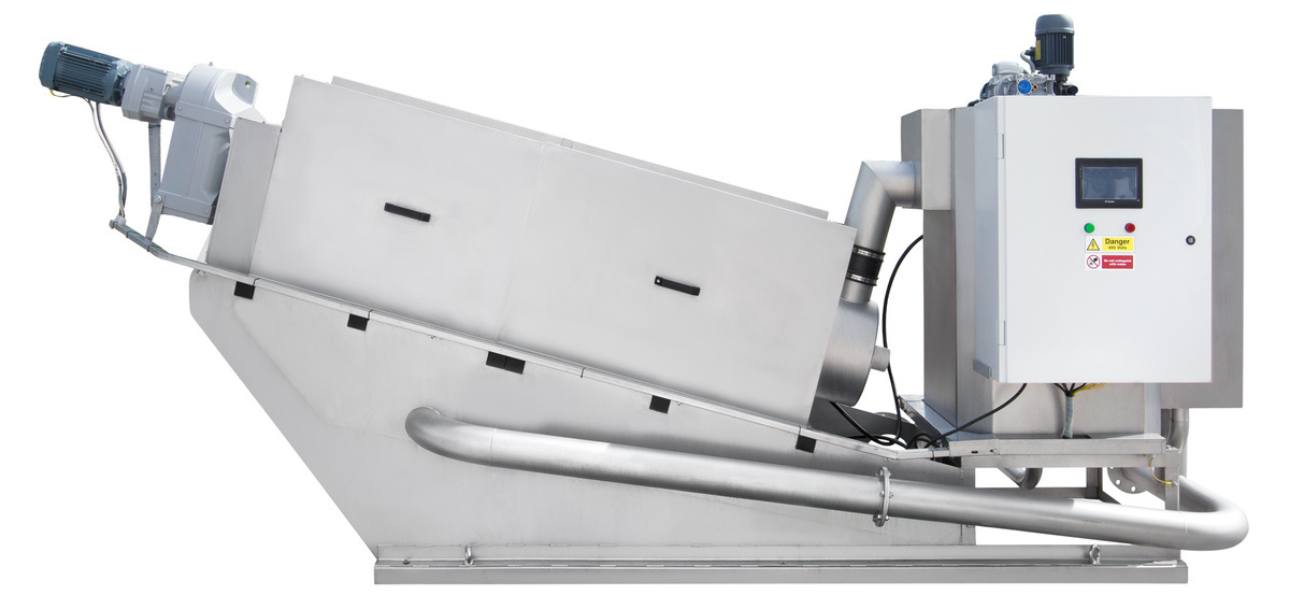 This flocculation process, taking place in the mixing chamber, is enhanced by slow agitation with the flocculant. Next, the sludge is moved to the screw assembly, which features fixed and variable helix plates that act as a self-cleaning filter.