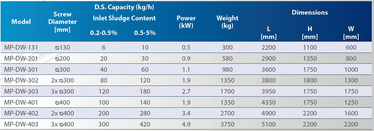 Sludge water goes into the Dewatering Screw Press via a feeder pump, leading to an inlet chamber that optimizes the flow via an overflow system.