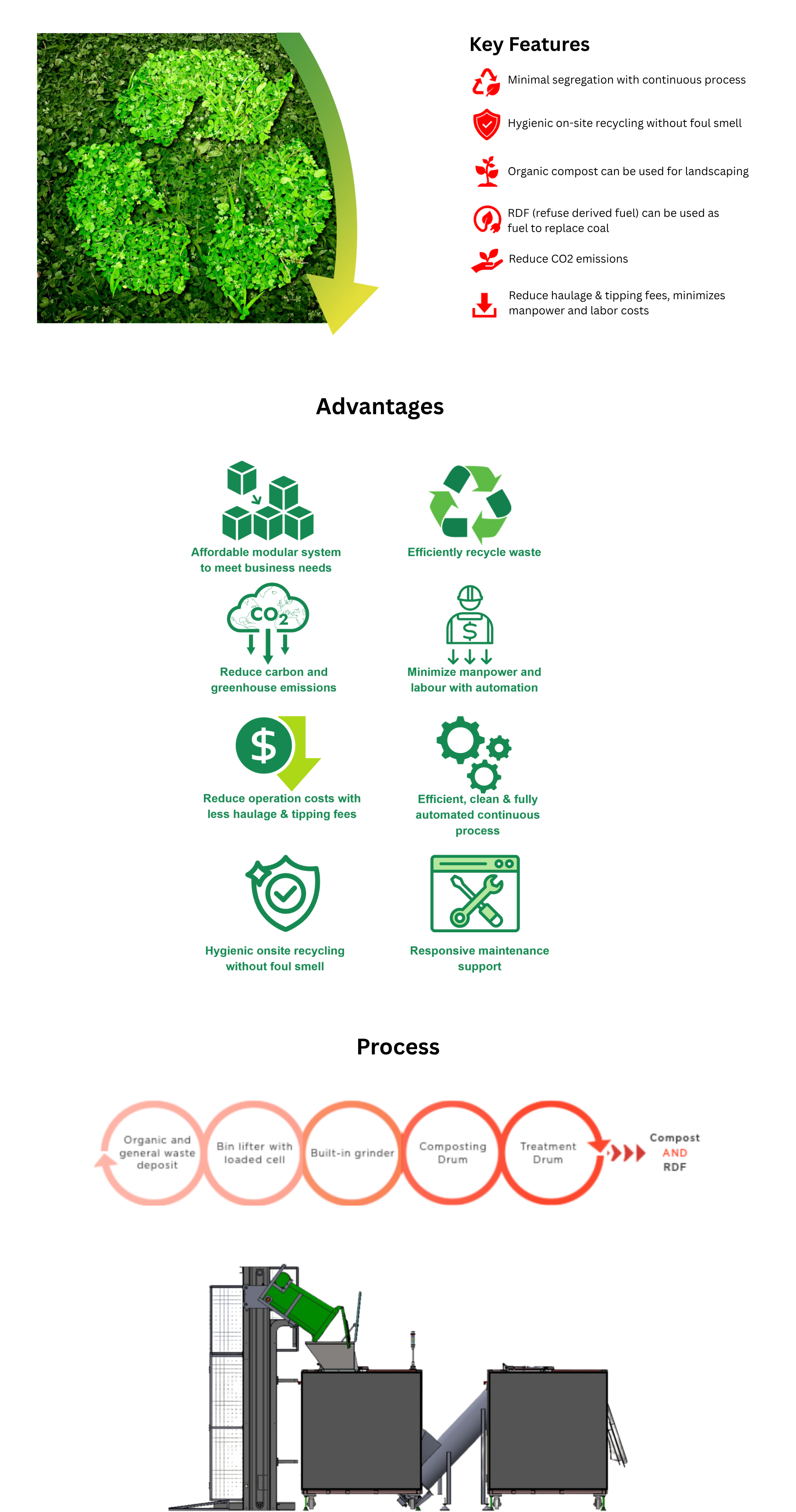 Modular Solid Waste Recycling. Processes various non-recyclable waste types, including plastics, food wastes, single-use foof containers, and discarded packaging materials, to produce organic compost or refuse-derived fuel (RDF) which can be used as an alternative to fossil fuels in cement kilns, power plants, and industrial boilers. This solution does not require segregation and reduces landfill waste, decreases fossil fuel consumption, and lowers CO₂ emissions.